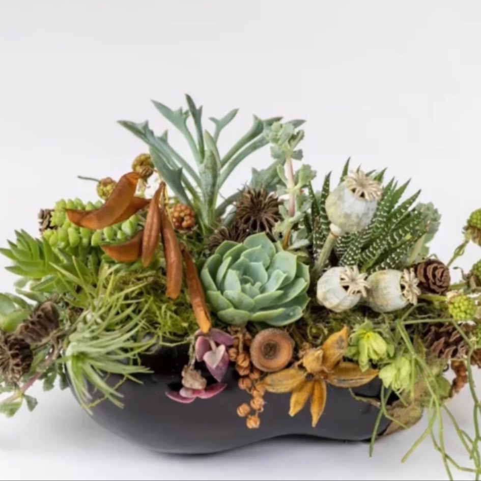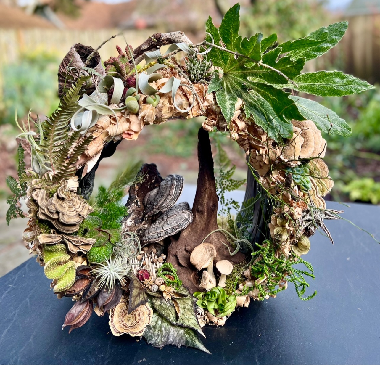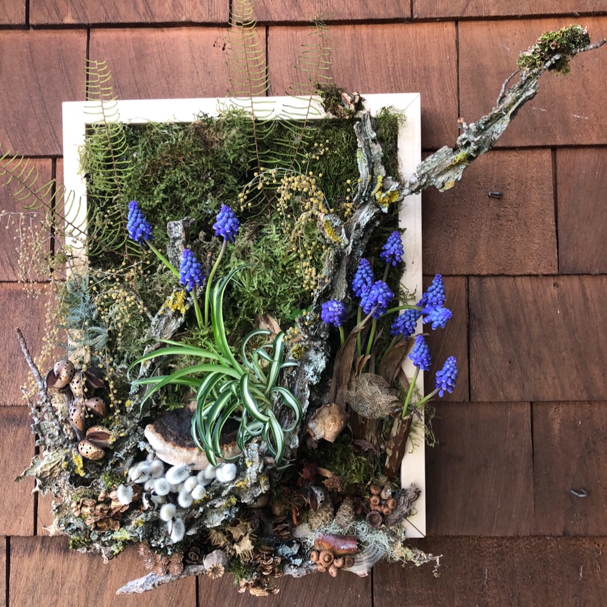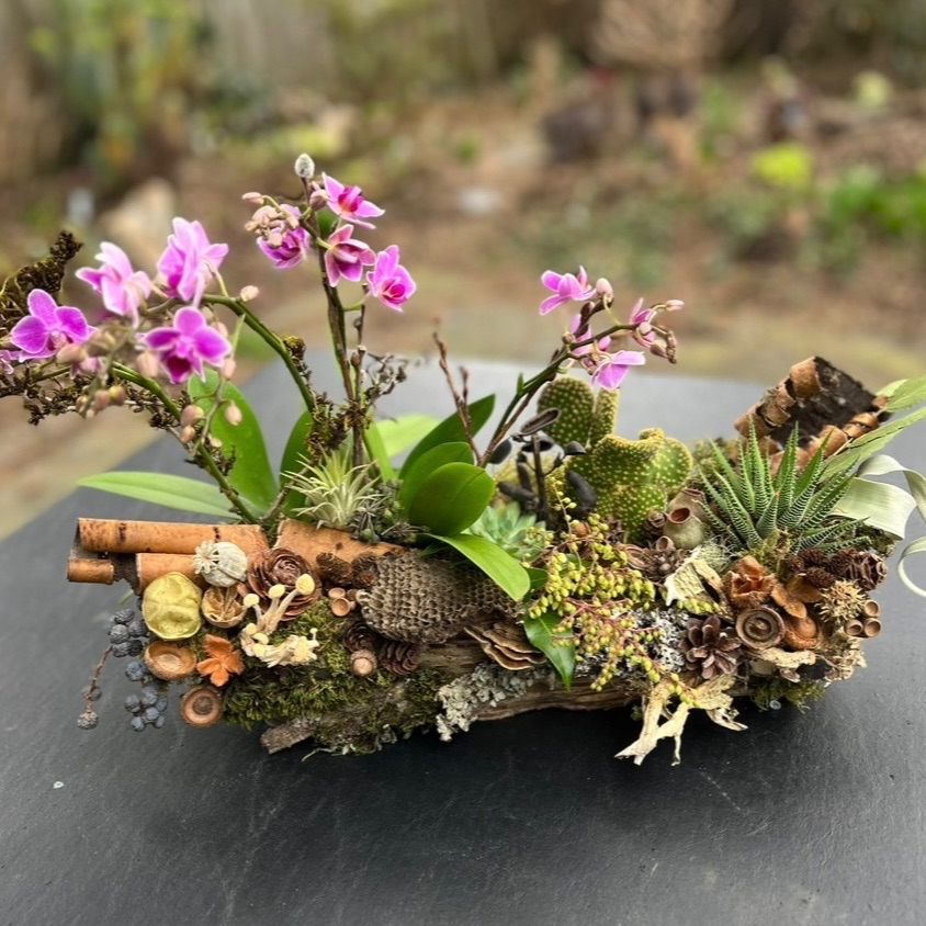 Learn how to design a woodland landscape on a frame. Using a variety of textures (seedpods, tillandsias, succulents, dehydrated mushrooms, etc...) and a few spring flowers. The class will learn how to create a unique landscape. Taking with them, design elements, mechanics and a woodland frame, to enjoy for a long time... read more.